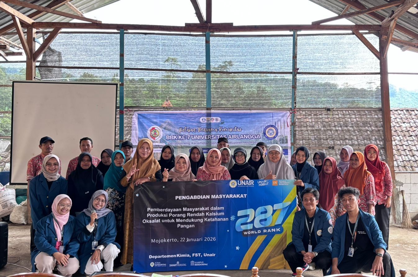 Mojokerto — Departemen Kimia Universitas Airlangga (Unair) melaksanakan kegiatan pengabdian kepada masyarakat bertema “Pemberdayaan Masyarakat dalam Produksi Porang Rendah Kalsium Oksalat untuk Mendukung Ketahanan Pangan” pada Kamis (22/1/2026) di Desa Gumeng, Kecamatan Gondang, Kabupaten Mojokerto.